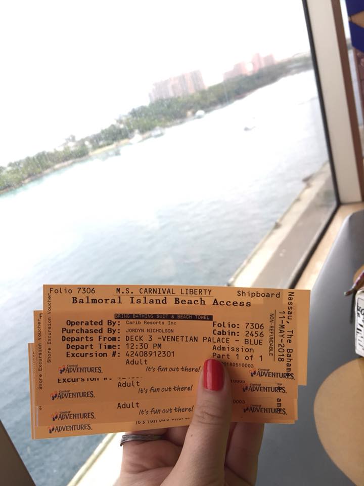 For those of you who have never cruised, once a cruise docks in a port of call, you can sign up and pay for excursions offered by the ship, which are typically crew led activities such as tours, water activities (scuba diving, boat tours,etc), and much more. These excursions can be costly however, and as we were in Nassau for only a few hours, we decided against paying extra and instead were going to wander along our own route and explore before hopping back onto the Liberty. Donkey, though, let us know of a new excursion, for only $25/piece we could travel to Balmoral Island, Nassau's private beach resort. We stopped down and booked our excursions and then headed into the ship's Venetian Palace Theater to await our guide.